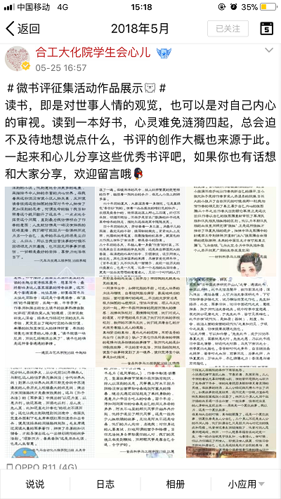 此次活動(dòng)的主要形式是鼓勵(lì)同學(xué)們將自己的讀書所思所感用文字記錄下來,并與身邊的人一起分享,以此帶動(dòng)更多人閱讀。活動(dòng)依托化學(xué)與化工學(xué)院微信公眾號(hào)“合工大化學(xué)與化工學(xué)院”和QQ公眾號(hào)“合工大化院學(xué)生會(huì)心兒”平臺(tái)進(jìn)行宣傳、征集、展示以及評(píng)選,受到全校同學(xué)的廣泛關(guān)注與好評(píng)。