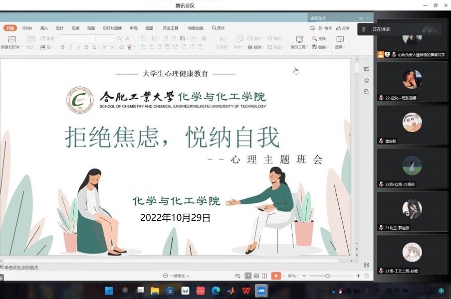 為指導(dǎo)班級心理委員有序開展心理主題班會,引導(dǎo)同學(xué)們牢固樹立新冠肺炎疫情和自身心理問題同防的健康理念。10月29日,化學(xué)與化工學(xué)院心理協(xié)會組織開展線上“拒絕焦慮,接納自我”心理主題班會培訓(xùn)活動,全體低年級班級心理委員參加此次培訓(xùn)活動。