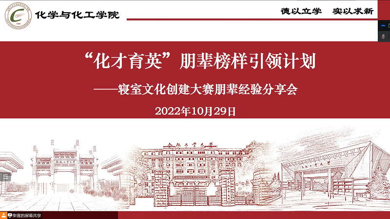 為積極發(fā)揮朋輩作用,推動寢室文化創(chuàng)建大賽高效高質(zhì)量開展。10月29日,化學(xué)與化工學(xué)院學(xué)業(yè)發(fā)展協(xié)會面向低年級寢室長,線上開展了“寢室文化創(chuàng)建大賽朋輩經(jīng)驗(yàn)分享會。