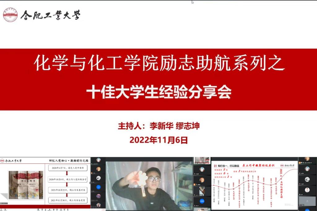 11月6日下午,化學(xué)與化工學(xué)院線上開展了勵志助航系列之“十佳大學(xué)生”分享會,輔導(dǎo)員繆志坤、李新華主持會議,2021級、2022級全體本科生參會。