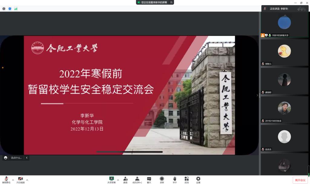 12月13日下午,化學與化工學院開展2022年寒假前暫未離校學生安全穩(wěn)定交流會,學院2023屆本科畢業(yè)班輔導員李新華主持會議,暫留校學生參會。