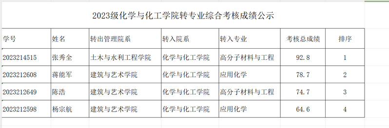 2023級(jí)化學(xué)與化工學(xué)院本科生轉(zhuǎn)專業(yè)綜合考核成績(jī)公示